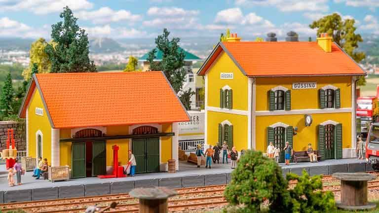 В то время как следующий модельный поезд неторопливо въезжает на рельсы, на станции Гюссинг царит оживленная миниатюрная суета! Маленький вокзал лимонно-желтого цвета с темно-зелеными ставнями и очаровательной красной черепичной крышей органично вписывается в самые разнообразные пейзажи. Модель, вдохновленная цветом реального железнодорожного вокзала Гюссинг в Австрии, также создает радостные акценты на модельном комплексе своим ярким слоем краски!