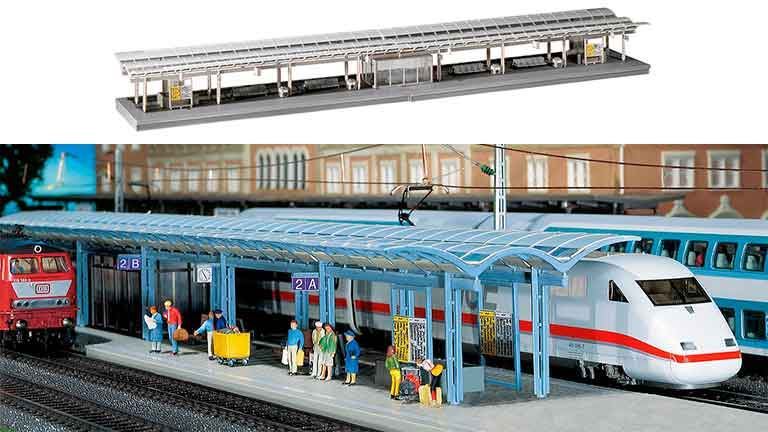 2 Платформы ICE в современном исполнении, с застекленным залом ожидания, скамейками, корзинами для бумаг и информационными табло. Может быть продлен на любой срок. Может быть освещен световой полосой (FALLER 180654).
