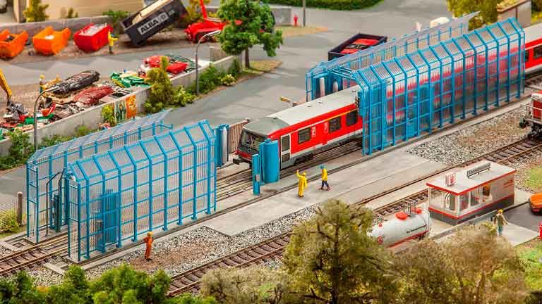 Для действующей станции и депо! Механическая мойка поездов и трамваев для наружной мойки вашего подвижного состава избавляет от необходимости мытья с помощью скруббера и шланга. При проезде колонны выполняют предварительную и последующую мойку, а различные стационарные пары боковых роликов выполняют очистку. Закрытая конструкция рамы позволяет устанавливать ее на открытом воздухе. Модель без функции.