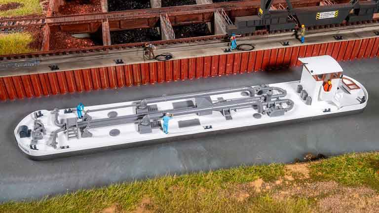 Судно-заправщик для внутреннего плавания! Эта модель танкерного судна привносит аутентичный портовый и промышленный колорит в любой объект. Сплющенный корпус, рулевая рубка и система трубопроводов на палубе придают ему индустриальный вид. Модель ватерлинии – неплавучая, но идеально подходит для создания реалистичных водных пейзажей в модели.
