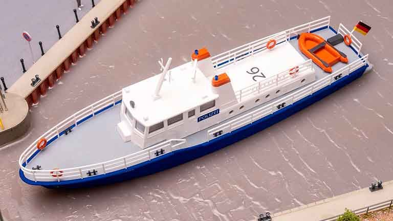 Модель маленького синего полицейского катера (модель по ватерлинии - неплавучая) предназначена в основном для использования на внутренних водоемах и реках. С заостренным корпусом и выкрашенной в белый цвет рулевой рубкой, четко обозначенной надписью "Полиция", он отправляется в свой следующий рейс. В просторном грузовом отсеке можно разместить различное оборудование, а в комплекте идет подходящая красная спасательная шлюпка.