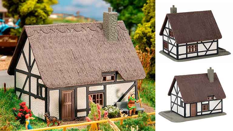 Простой и привлекательный дизайн небольшого фахверкового дома в северонемецком стиле. Идеальная модель для макета железной дороги или небольшой диорамы с ограниченным пространством.