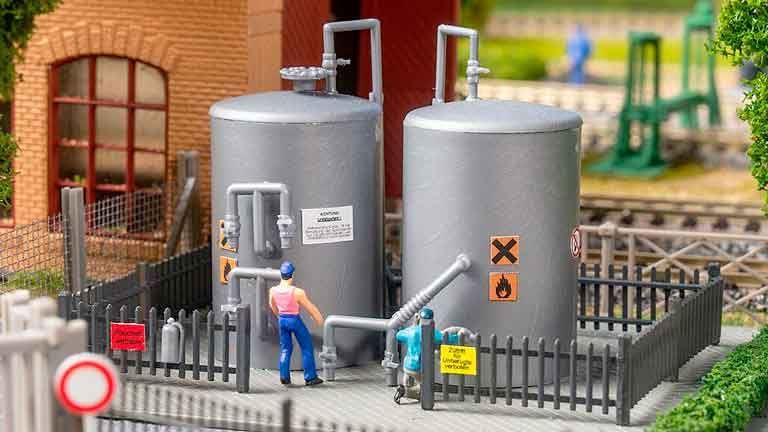 Два серебряных резервуара для хранения привнесут промышленный шарм в ваш модельный комплекс. Огороженные забором и снабженные несколькими предупреждающими знаками, они легко вписываются в производственные помещения, зоны погрузки или железнодорожные станции. Простая, но эффектная деталь для реалистичных сцен в промышленных условиях.