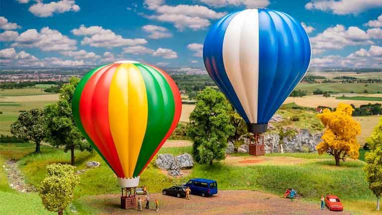 Два воздушных шара с куполообразными оболочками, один с белыми и синими полосами, другой с красными, зелеными и желтыми полосами, плетеные корзины для воздушных шаров и горелки. Может быть доукомплектован световым мини-эффектом «Мерцающий огонь», FALLER 180695.