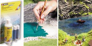 Набор для создания имитации водной поверхности рек, ручьев, озёр, прудов и других водоёмов, (100 мл + 3 × 10 мл). Рекомендуется для железнодорожных макетов типоразмера G, 0, H0, TT, N, Z. Возможно размещение в любом месте макета или диорамы.