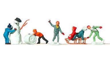 Дети со снеговиком и санками (набор фигурок), 1:87