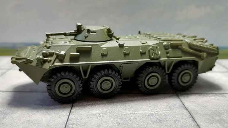 Коллекционная модель «Бронетранспортёр БТР-70» из цветного пластика рекомендуется для железнодорожных макетов в масштабе 1/87 типоразмера H0. Окраска модели не требуется.
