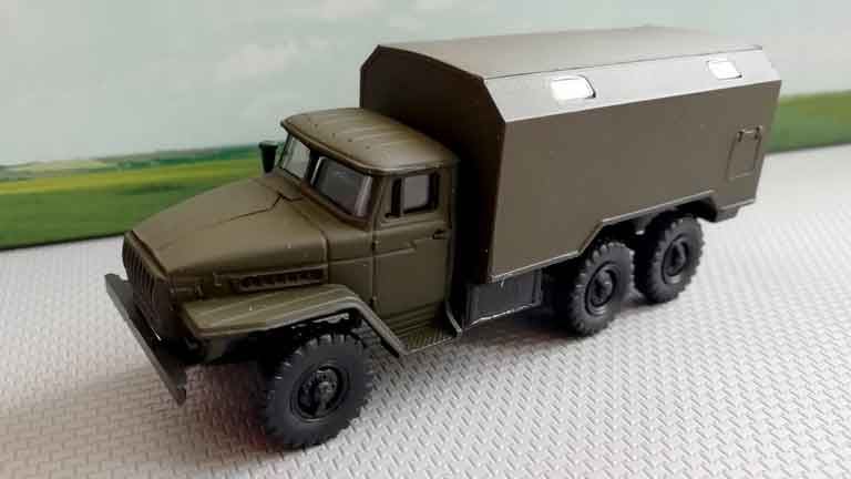 Коллекционная модель «КУНГ-К4320 (без запасного колеса на задней части кузова) на базе автомобиля УРАЛ 4320» из пластика рекомендуется для диорам в масштабе 1/87 и железнодорожных макетов типоразмера Н0 (1:87). Окраска модели не требуется.