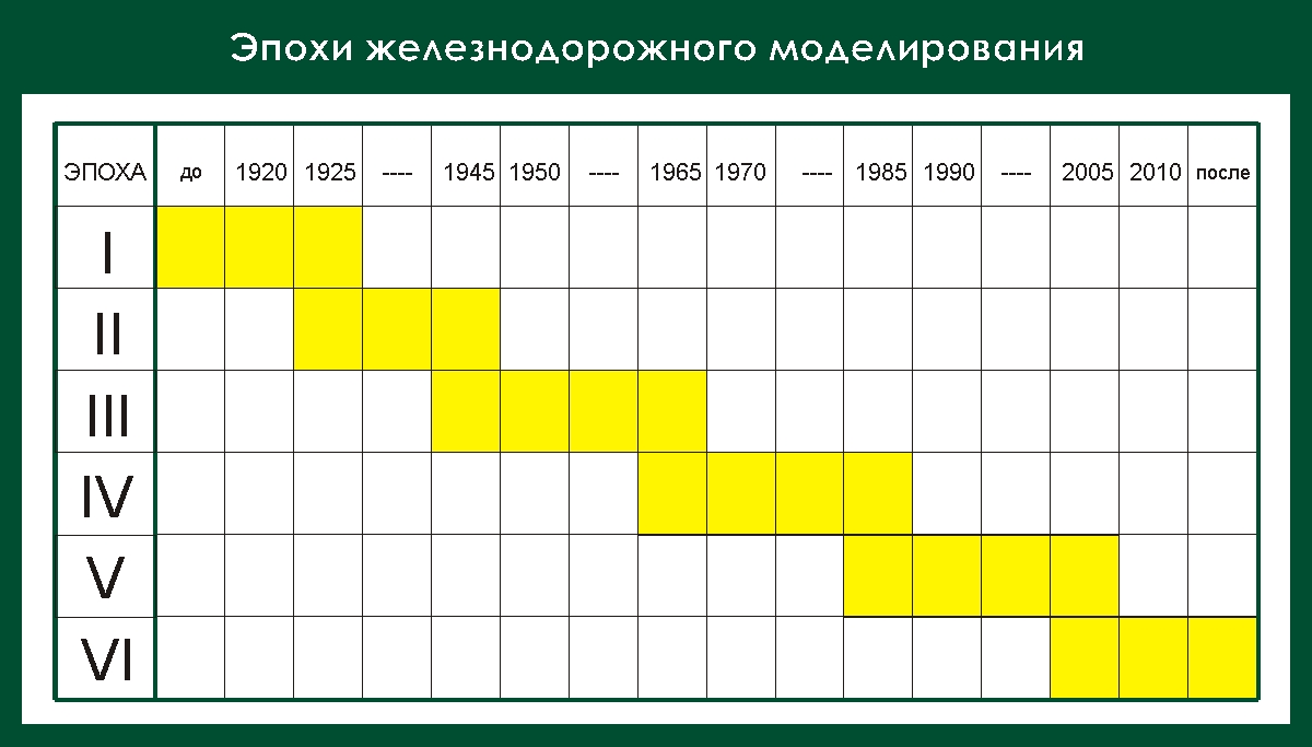 Здесь понятие Эпоха является совокупностью характерных визуальных элементов определенного периода времени, их сочетания и привязки. Разбивка шкалы времени в железнодорожном моделировании достаточно условна, с исторической точки зрения, и деление это не должно быть резким. Временной переход от одной Эпохи к другой совершался плавно и постепенно, с различными исключениями и допусками.