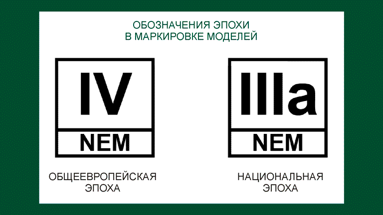 Кроме того в Нормах (MOROP NEM 800) кратко описываются характеристики Эпох применительно к истории железных дорог различных стран. Здесь уже каждая эпоха делится на Периоды. Эти Периоды обозначены в Нормах маленькими латинскими буквами, и означают определенные вехи в истории железной дороги той страны, о которой идет речь. К примеру, в Германии (NEM 806D)