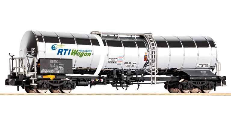 Четырехосный вагон-цистерна для химикатов в масштабе 1:160 впечатляет своими отдельно стоящими лестницами, поручнями и глянцевой хромированной цистерной в дизайне RTI.